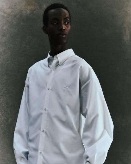 美しい光沢感を持つスーピマポイントオックス生地を使用。シワが軽減されやすい特殊加工。ワイドシルエット。