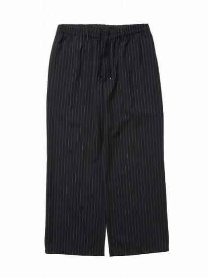 光沢とドレープが特徴のウールとポリエステル混紡のウォッシャブル平織生地を使用。強撚糸を使用することによりドライなタッチと生地に程よいハリ感が備わっている。ドローストリングのイージー仕様。前開き有り。ゆったりとしたストレートシルエット。