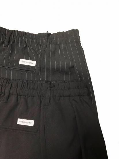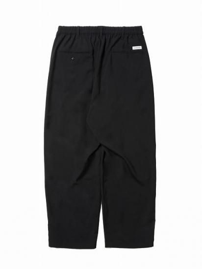 光沢とドレープが特徴のウールとポリエステル混紡のウォッシャブル平織生地を使用。強撚糸を使用することによりドライなタッチと生地に程よいハリ感を持つ。ドローストリングのイージー仕様。前開き有り。2タックのワイドシルエット。