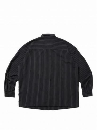 光沢とドレープが特徴のウールとポリエステル混紡のウォッシャブル平織生地を使用。強撚糸を使用することによりドライなタッチと生地に程よいハリ感が備わっている。ワイドシルエット。