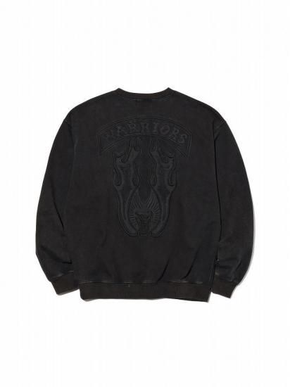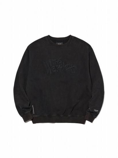オリジナルで作成した肉厚なコットン裏毛素材を使用したクルーネックスウェットシャツ。身頃全体にピグメント加工を施し、ヴィンテージな風合いに仕上げた。フロントにWarriorsロゴ、背面にエンブレムモチーフを立体感のある刺繍で表現したデザイン。左袖にブランドロゴ、前身頃右下にコピーライトロゴをラバープリントで配置。身幅にゆとりのあるシルエット。
