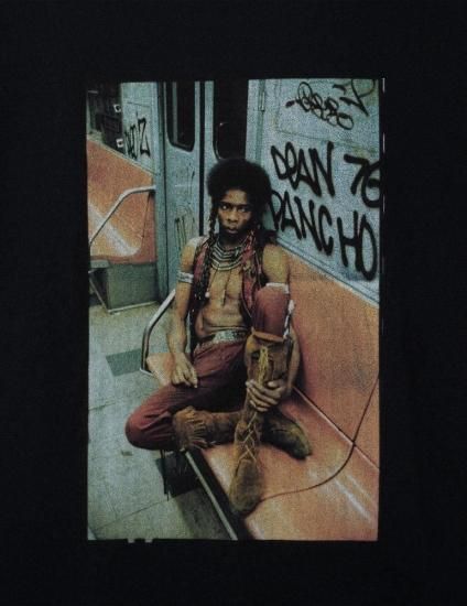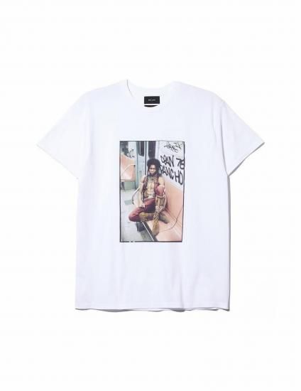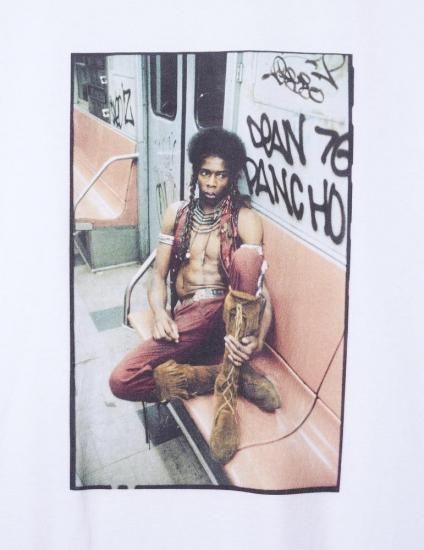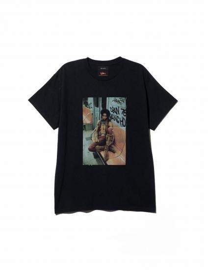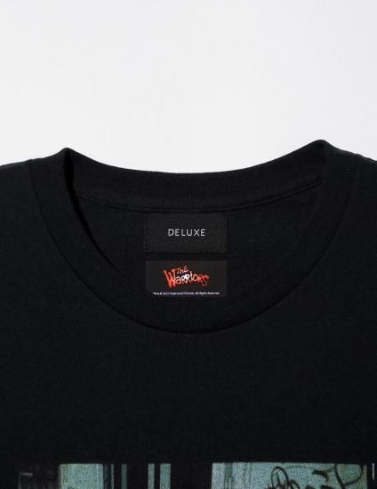 フロントにWarriors劇中フォトを、左袖にブランドロゴ、前身頃右下にコピーライトロゴをラバープリントで配置したデザイン。