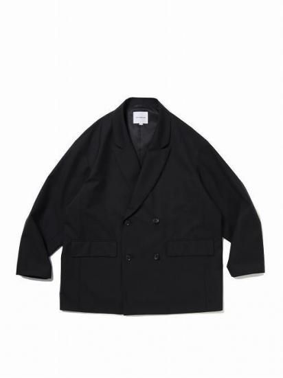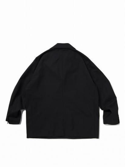 ウール、ポリエステルの混紡糸の高密T/Wサキソニーを使用。クリアな光沢と程よいドレープ性を持つ。表地撥水加工。裏地に肌当たりのいいキュプラツイルを使用。ワイドシルエット。