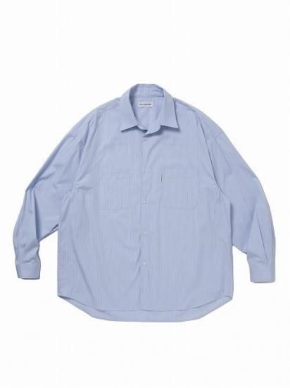 スビンコットンとギザコットンの混紡糸で織り上げられたストライプブロードを使用。上質な光沢感を持つ。ワイドシルエット。