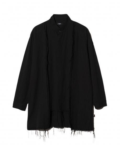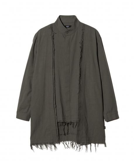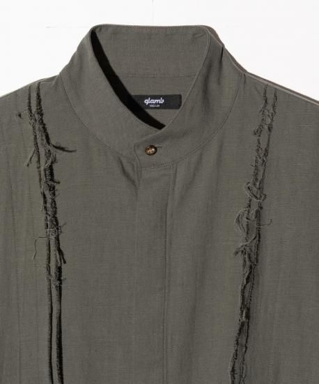 フェイクレイヤードを駆使して季節感を捉えたフォークロアスタイルを提案するLayered Cardigan Shirt。身生地に用いたのはスラブ混リネンコットンの風合い豊かなテキスタイル。着丈と身幅を長く設定したアウターライクなルーズシルエットのボディに、カーディガンタイプのレイヤードパーツを同生地でドッキングすることでボヘミアン調の佇まいを生み出しました。エッジ部分はカットオフで始末した後、仕上げのウォッシュ加工でほつれを演出。glambらしいダメージのニュアンスが放浪者然としたエイジングルックを完成させます。