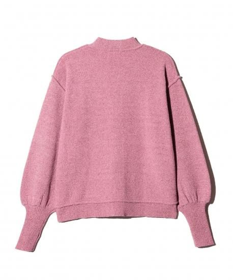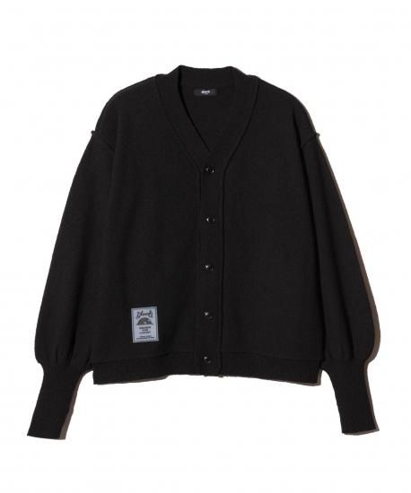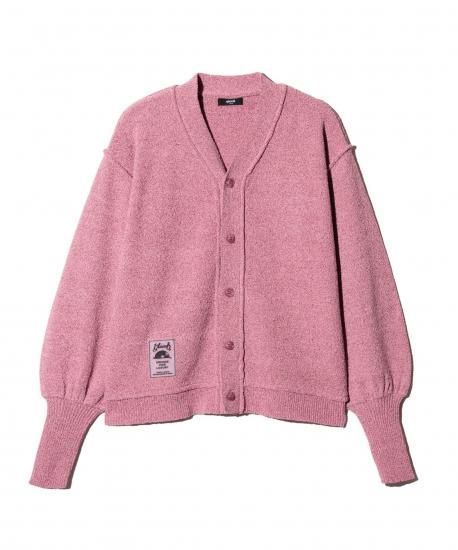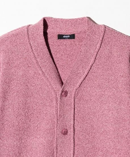 glambの人気シリーズの一つ、Creed Knitのエッセンスをカーディガンに落とし込んだCreed Cardigan。アームにコントラストあるシルエットを描き出すのはサムホールを備えたロングリブの袖口。ワイドな袖が手元に溜まり、エレガントなボリュームを形作ります。アームホールや前立てでは縫い代を表に出して立体感あるテクスチャ変化を描出。右裾にクリア素材のラバータグをあしらってアクセントを添えました。テキスタイルに用いたのは、ドライタッチのブークレ糸をミドルゲージで天竺裏目使いしたマテリアル。糸の輪を表に出すことで独特のラフな質感を見せています。シルエットは着丈短めのルーズフィット。Vネックを浅めに取ることでカジュアルに寄り過ぎないバランスを持たせています。