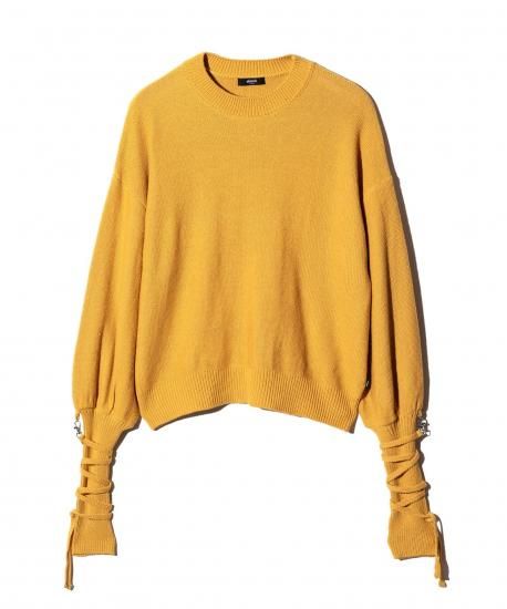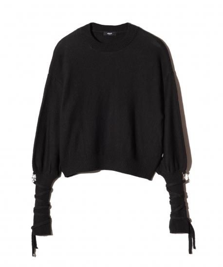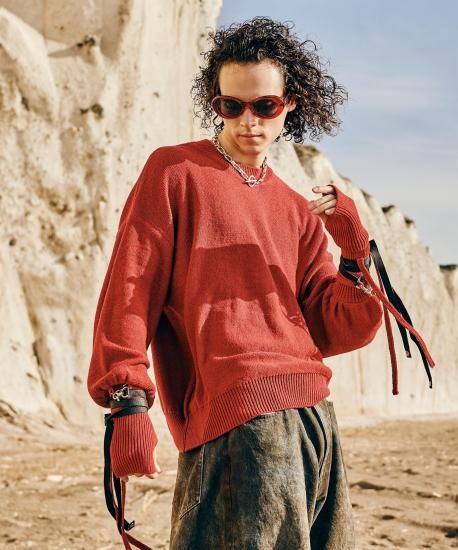 緩急あるシルエットメイキングでプルオーバーニットを再構築したCreed Knitが今季ならではの意匠を備えて登場。ミドルゲージの天竺裏目使いで仕立てたボディは従来よりもショート丈としたボックスシルエット。ロングリブで緩急ある輪郭にまとめたアームは袖口にサムホールを、さらに新たなギミックとしてニットテープを配しました。こちらはそのまま垂らしたり、リブに巻いてロックスタイルにしたりとアレンジが可能。今季のアクセサリーラインで用意されるストラップシリーズ(*)のさらなる重ね付けもブランドからの提案です。