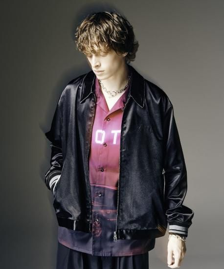 コンパクトなシルエットと艶やかな素材使いが往年のアウトサイダールックを彷彿とさせるShort Satin Jacket。着丈を短めにまとめたブルゾンタイプのボディはテキスタイルにサテン生地を使用。一見するとスカジャンのようでもありながら、首元はパイピングを施したレギュラーカラーでエッジのある佇まいにまとめています。モノトーンのBlackに対してBeigeは配色使いと、カラーバリエーションごとに異なるムードも本作の特徴。軽さある着心地を生かし、アウターのみならずシャツ感覚でもスタイリングいただけます。