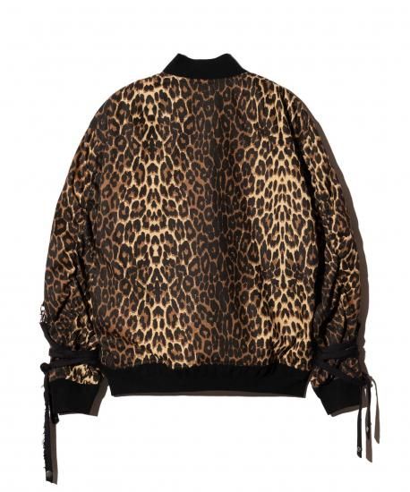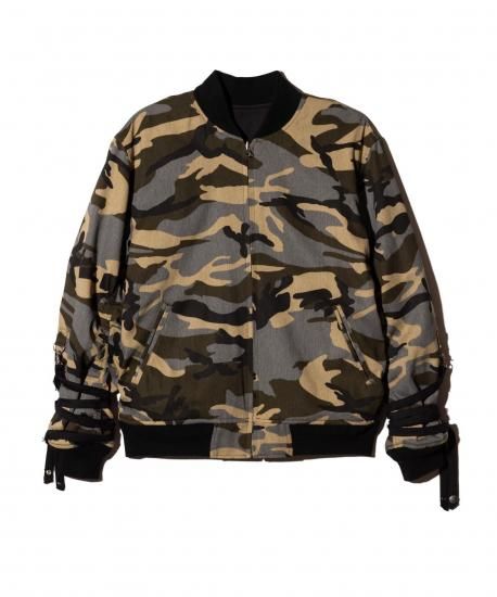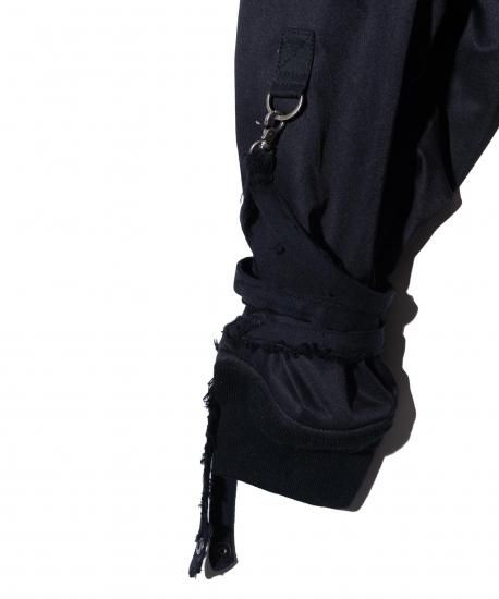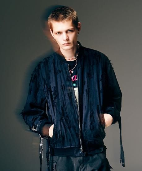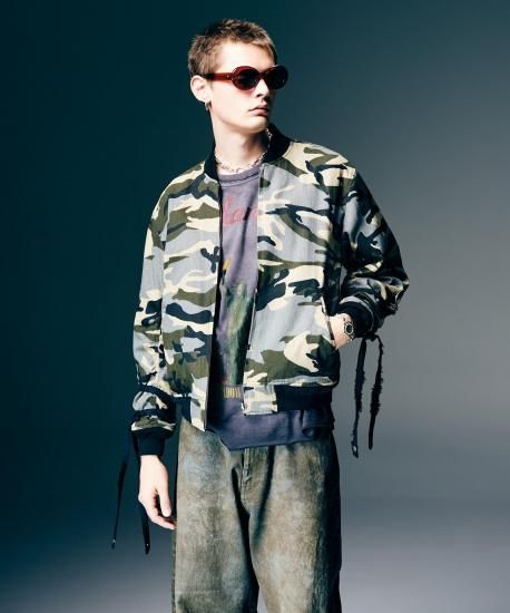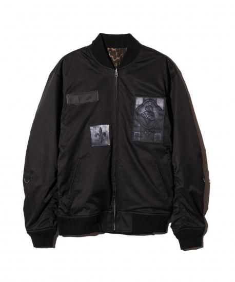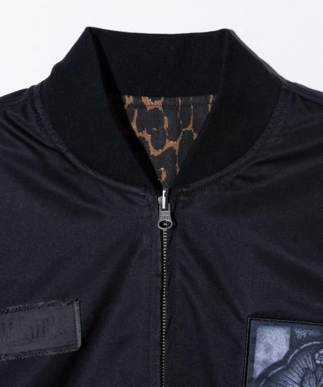 “Shadow of the Wind”をコレクションテーマに掲げた今季のglambのリリカルな世界観をミリタリーウェアに掛け合わせたBlow Reversible Bomber Jacket。ワイドシルエットのボディは宗教画や紋章の当て布を身頃の前後にパッチ。柄の中には音楽にまつわるモチーフをさりげなく隠し込んだglambらしいグラフィックワークが発揮されています。そこにあしらわれた今季のシーズンディテールが左右の袖口のDカンに繋がれるロングテープ。袖口に巻き付けたボンデージ的なアレンジもブランドからの提案です。逆面にはカラーバリエーションごとに異なるテキスタイルを使用。総柄使いのLeopardとCamoに加え、立体的なフリンジがランダムに覗くBlackもラインナップします。ボディはリバーシブルとなっており、袖口のDカンも両面に用意。ボディの2WAYとロングテープのアレンジを掛け合わせ、幅広いスタイリングを形作ることのできる1着となっております。