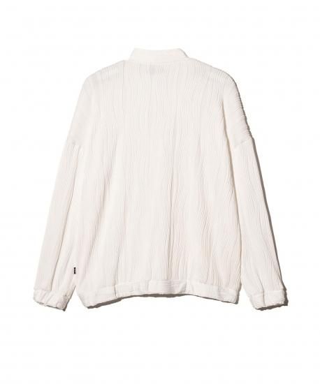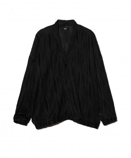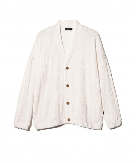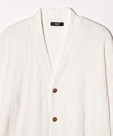 glambの人気カットソー“Willow Crepe”をカーディガンスタイルで提案するWillow Crepe Cardigan。素材に用いたのは凹凸のある流線形のタックが刻まれた生地。編み針で網目を作り、さらに編み地に結び付けるという丹念な工程によって奥行のある畝を形作っています。コンパクトに設計されたシルエットはシャツやTシャツの上から羽織ってももたつかず、エッジィな印象。Willow Crepe Pantsとセットアップでの展開となりますが、単体でもシーズンレスに幅広いスタイリングへ対応します。