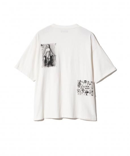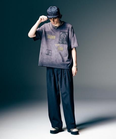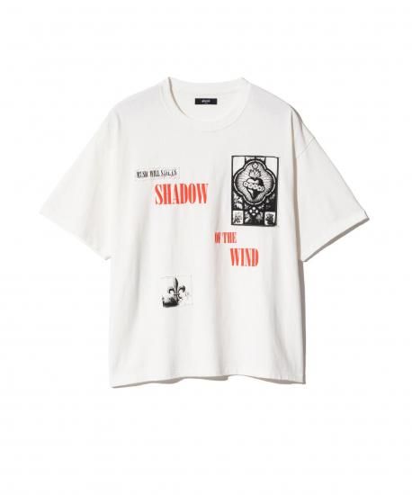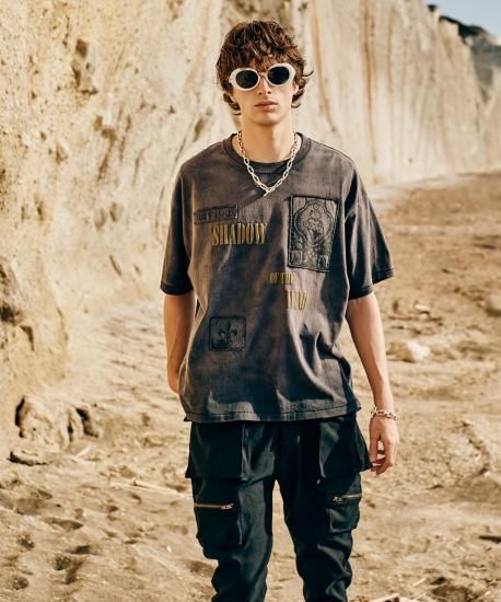 “Shadow of the Wind”をテーマに掲げる今季、光と陰のミステリアスな世界観を迫真のヴィンテージクラフトで具現化したSacred Damage Cutsew。フロントに当て布であしらったのは神秘的な柄使い。そこにテーマのタイポグラフィをアクセントカラーの発泡プリントであしらって荘厳なムードをまとわせています。バックスタイルに配したのは楽譜やヘッドフォンをかけたマリアモチーフ。音楽へのリスペクトをデザインに昇華するglambらしいルックを作り上げました。ドライなヴィンテージタッチを持ったコットン生地を使用したボディは独自のウォッシュ加工によって経年変化の風合いを演出。袖口と裾は90年代以前のTシャツに見られるシングルステッチで仕上げ、そのムードにさらなるリアリティを与えています。仕上げに手作業によって随所にダメージも加えることでヴィンテージの面持ちが完成。シルエットは広めの身幅と短めの着丈をかけ合わせたルーズフィットとなっております。