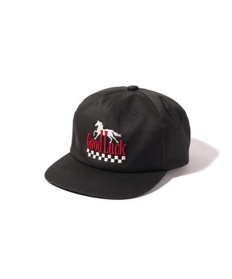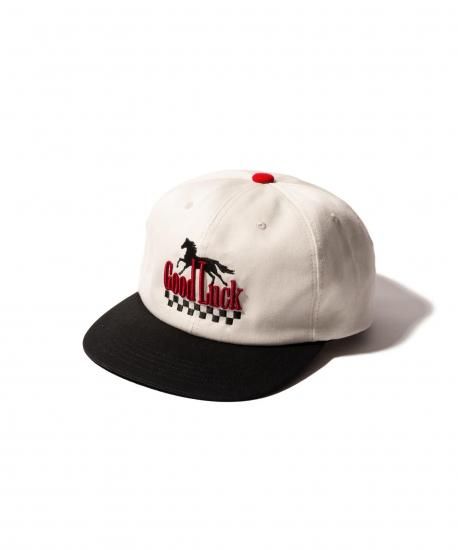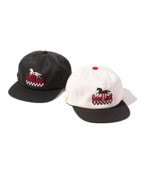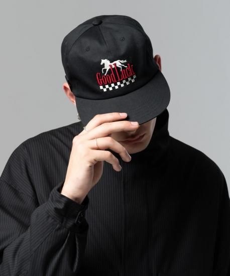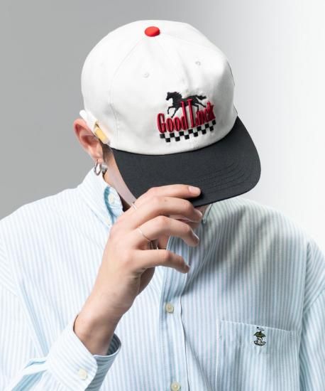 アメリカンデザインを掛け合わせたノスタルジックな佇まいのGood Luck Cap。駆け抜ける馬とチェッカー柄は平刺繍、メッセージロゴは立体刺繍と意趣を凝らした作りで仕上げています。サイドにはシガレットやペンを挿せるタブを備え、ストリートギャンブラーの所作を想起させるディテールが。縫製から仕上げまでをMADE IN JAPANで丹念に仕上げてお届けします。