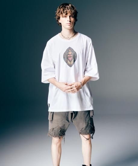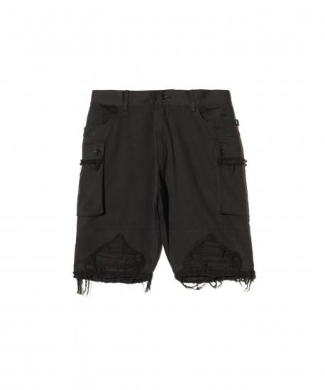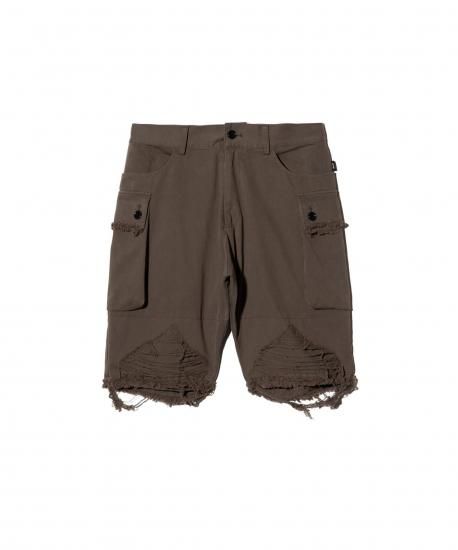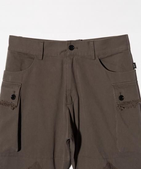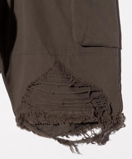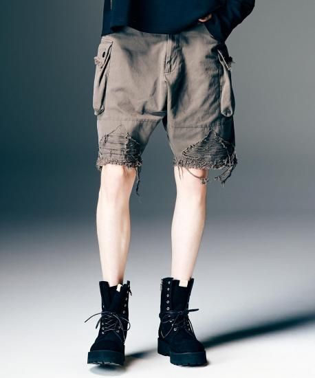 ショーツにハードなダメージを掛け合わせ、春夏のイージースタイルにglambならではのグランジィなテクスチャを乗せるCrush Cargo Shorts。股上を深く設けたテーパードサルエルボディは、大振りなカーゴポケットがアクセント。フラップはカットオフ、裾はクラッシュを加えた後に仕上げのワンウォッシュを施してダメージを表出。裾は中厚手のコットン生地を2枚使いにすることで、クラッシュのほつれを最低限に抑えながら、膝の透けも抑えるという質実備えたディテール使いとなっています。