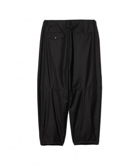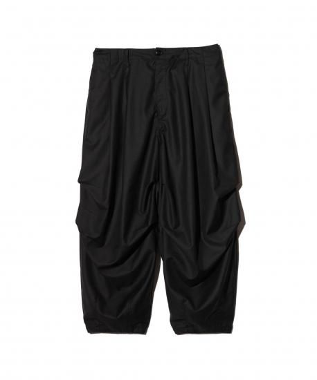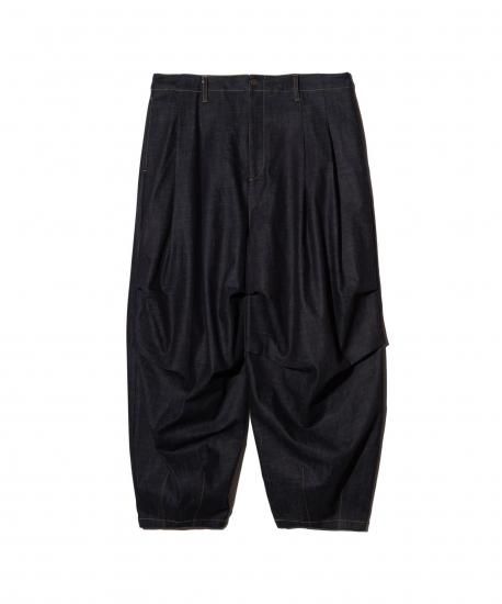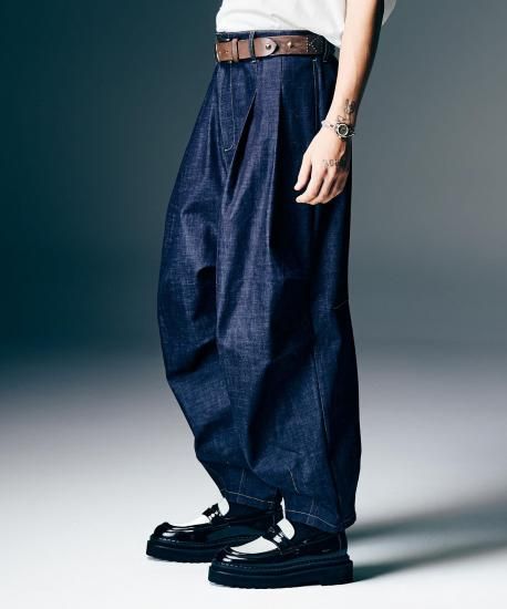 コレクションの度に好評を博すタック使いのバギーシルエット、そこへ不動のベーシック生地2種を落とし込んでglambならではのネオベーシックを提案するCrossover Tuck Pants。ボディは腰元に4タック、膝に2タック、裾にダーツを設けて構築したワイドバルーンシルエット。レングスは九分丈に設定しており、着用すると足元にオフバランスな視覚効果を演出します。2色展開となる本作では、Blackには滑らかな落ち感がレーヨン混スーツ地、Indigoにはクリーンなルックスのノンウォッシュデニムを使用。今季のglambでは和装のエッセンスを大胆に取り入れたKimono Denim Jacketを同生地でラインナップ、野心的なセットアップスタイルもお楽しみいただけます。