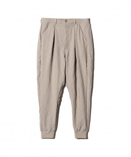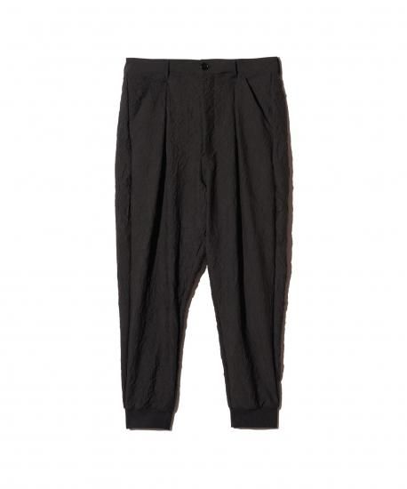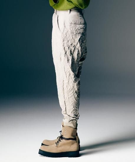 経年変化の表情をデザインに昇華、スラックスをアヴァンギャルドに再解釈したCrinkle Sarrouel Pants。2タックを備えたボディは深めの股上とテーパードを組み合わせてサルエルシルエットに。裾リブもあしらって股上から裾にかけて緩急あるテーパードラインを形作りました。テキスタイルに落とし込んだのは生地段階でキャッチワッシャー加工を施して皺を形状記憶させたライトウェイトのツイル生地。セットアップ展開となるCrinkle Shawl Collar Coatと合わせてコンセプチュアルなスタイリングをお楽しみください。