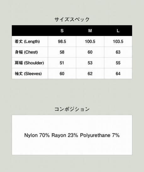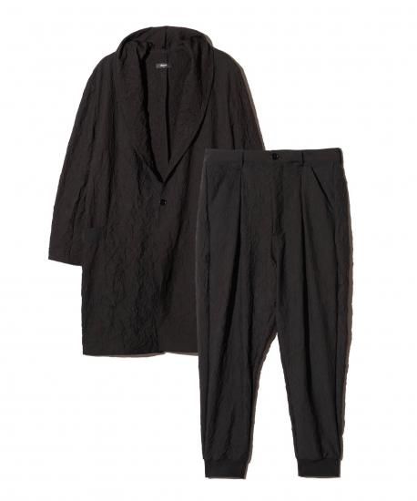 今季glambがテーマとして掲げる“Shadow of the Wind”の世界観を陰影あるテキスタイルに閉じ込め、コート×ボトムスのエアリーなセットアップを提案するCrinkle Coat Set Up。身生地に用いたのは生地段階でキャッチワッシャー加工によって皺の表情を刻んだ薄手のツイル生地。身幅に程よくゆとりを持たせた膝丈のトップスは、首元をショールカラーでまとめて優雅なムードに。ポケットはカジュアルな印象のアウトポケット、仕立ては芯や裏地を省いたアンコンとすることで、季節感を捉えたイージーな1着としてまとめています。ボトムスは2タックを備えたボディに深めの股上とテーパードを組み合わせたサルエルシルエット。裾リブもあしらって股上から裾にかけて緩急あるテーパードラインを形作りました。