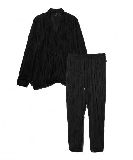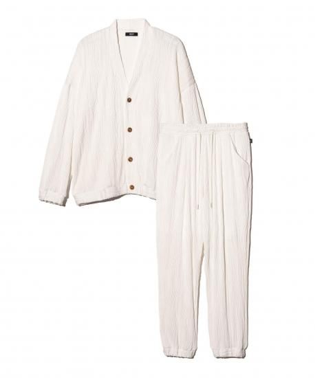 glambの人気カットソー“Willow Crepe”をカーディガンスタイルで提案するWillow Crepe Cardiganがセットアップで登場。楊柳生地を思わせるプリーツ状の流線型のタックは編み針で網目を作り、さらに編みを介して編地に結びつけるという手間を惜しまない工程で構築したもの。それをシャツやTシャツに羽織ってもだぶつかないコンパクトなカーディガンに仕立てました。ボトムスは腰元に1タックを取ったテーパードサルエルシルエット。裾部分はリブではなく身生地の横使いで表現、伸縮性と遊び心を兼ね揃えた仕立てであしらっています。
