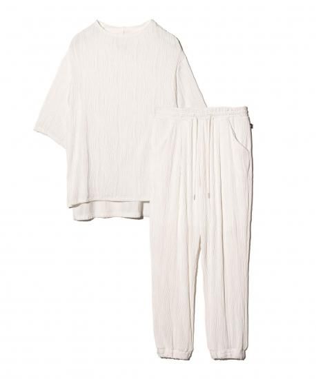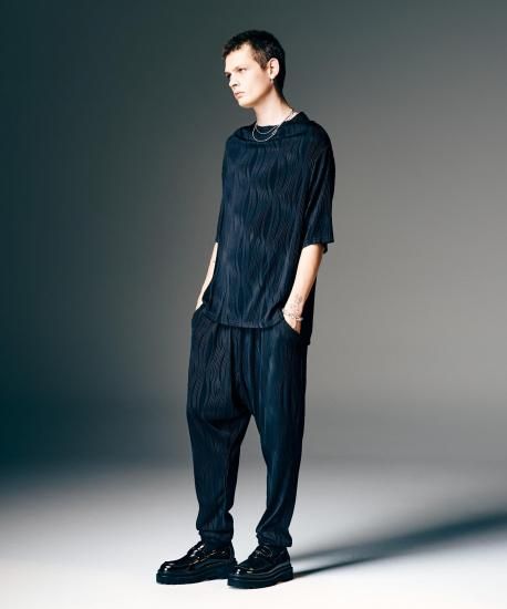 リュクスなテイストを醸し出すプリーツ使いでリリースの度に好評を博す“Willow Crepe”シリーズの新作が今春登場。テキスタイルに用いたのは凹凸ある流線形のタックが刻まれた楊柳調生地。編み針で網目を作り、さらに編み地に結び付けるという丹念な工程によって奥行のある畝を形作っています。トップスは前身頃をワイドに設定して前下がりを持たせてドレープを構築。身幅にゆとり、着丈に前後差を設けたボディはリラックスフィットながら動きある輪郭となっています。ボトムスは腰元に1タックを取ったテーパードサルエルシルエット。裾部分はリブではなく身生地の横使いで表現、伸縮性と遊び心を兼ね揃えた仕立てであしらっています。
