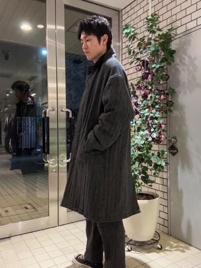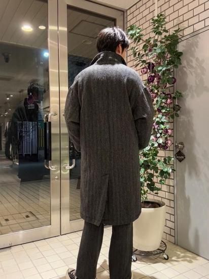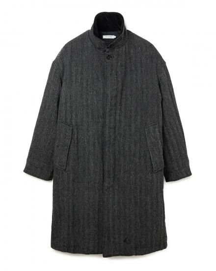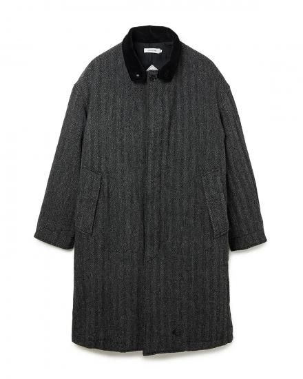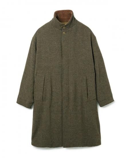 温かみのある表情のウールヘリンボーン素材を使用したバルマカーンタイプのロングコート。やや肩が落ちるリラックスシルエット。襟と袖口裏がコーデュロイ仕様のデザインが特徴で中綿を入れることで保温性にも優れている。